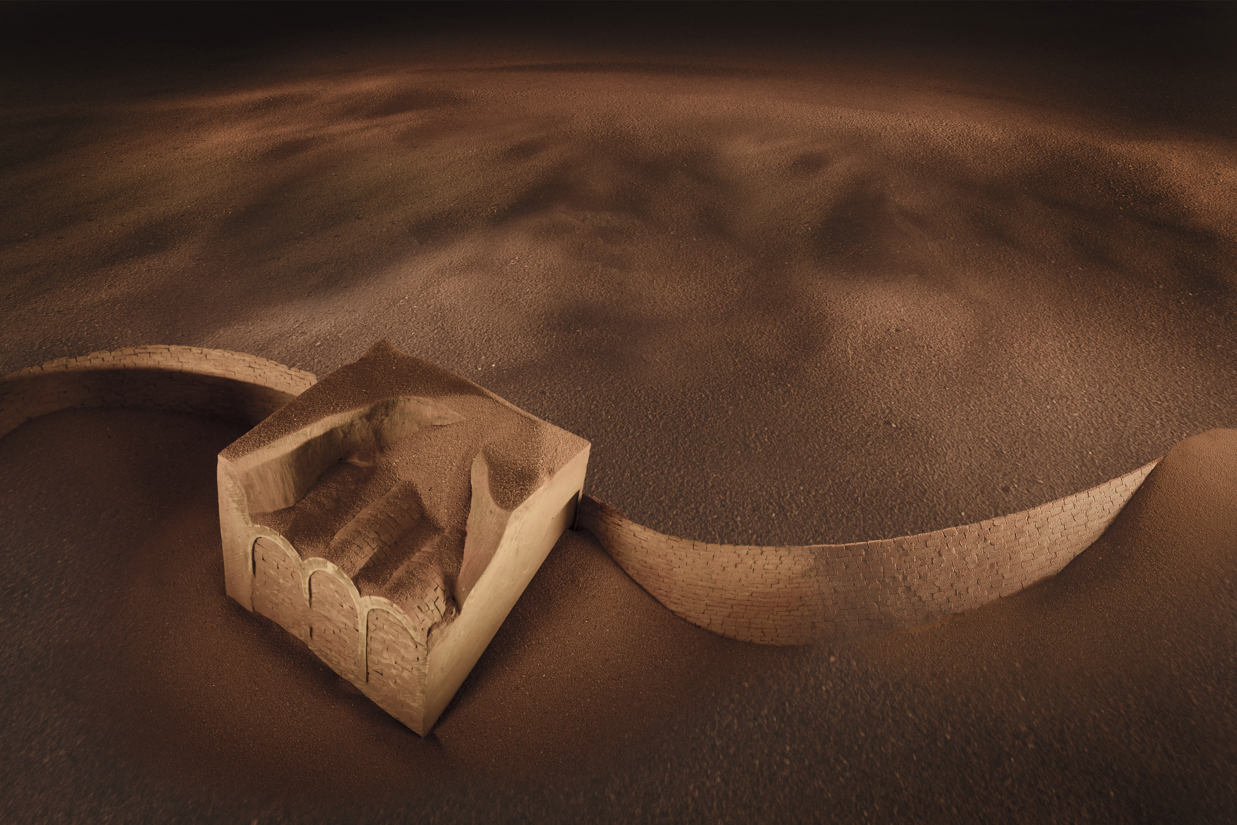 After firing, the elements were assembled into models and combined with sand tinted with ochre pigment.