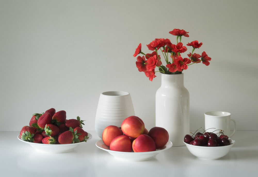 Beatifully executed, a still nature photograph speaking about how we can carry in our hearts a symbolic summer. I love the colours contrast, bringing to the white-greyish background and setting the intensity of the red colour - so specific for summer flowers and fruits. A tensed, though soothing, relationship between the coldness and artificial feeling of a studio (with its "invisible" lighting) and the freshness of the summer fruits and flowers. Well done!