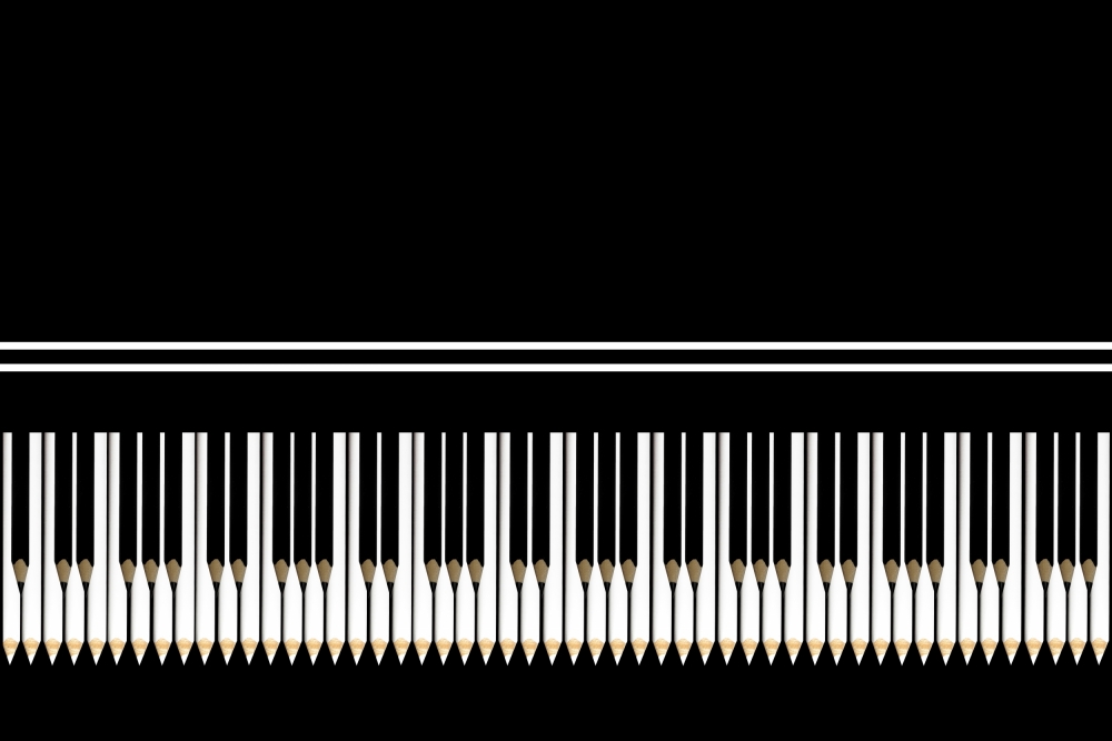 I used a long, white pencil and a short, black pencil to emulate the piano keys. My set consisted of a tabletop and a daylight lamp positioned directly over the table. Using a 180mm lens with my Canon 6D on a tripod, I first shot the white pencil on a piece of black cardboard. Being careful to not move the camera or tripod, I changed the set, placing a black pencil on white cardboard in the exact same spot on the table so that the lighting would match. I chose these opposite color schemes for a specific reason: in post-processing, I would be able to easily extract the pencils from their backgrounds by using a layer mask on each of them.