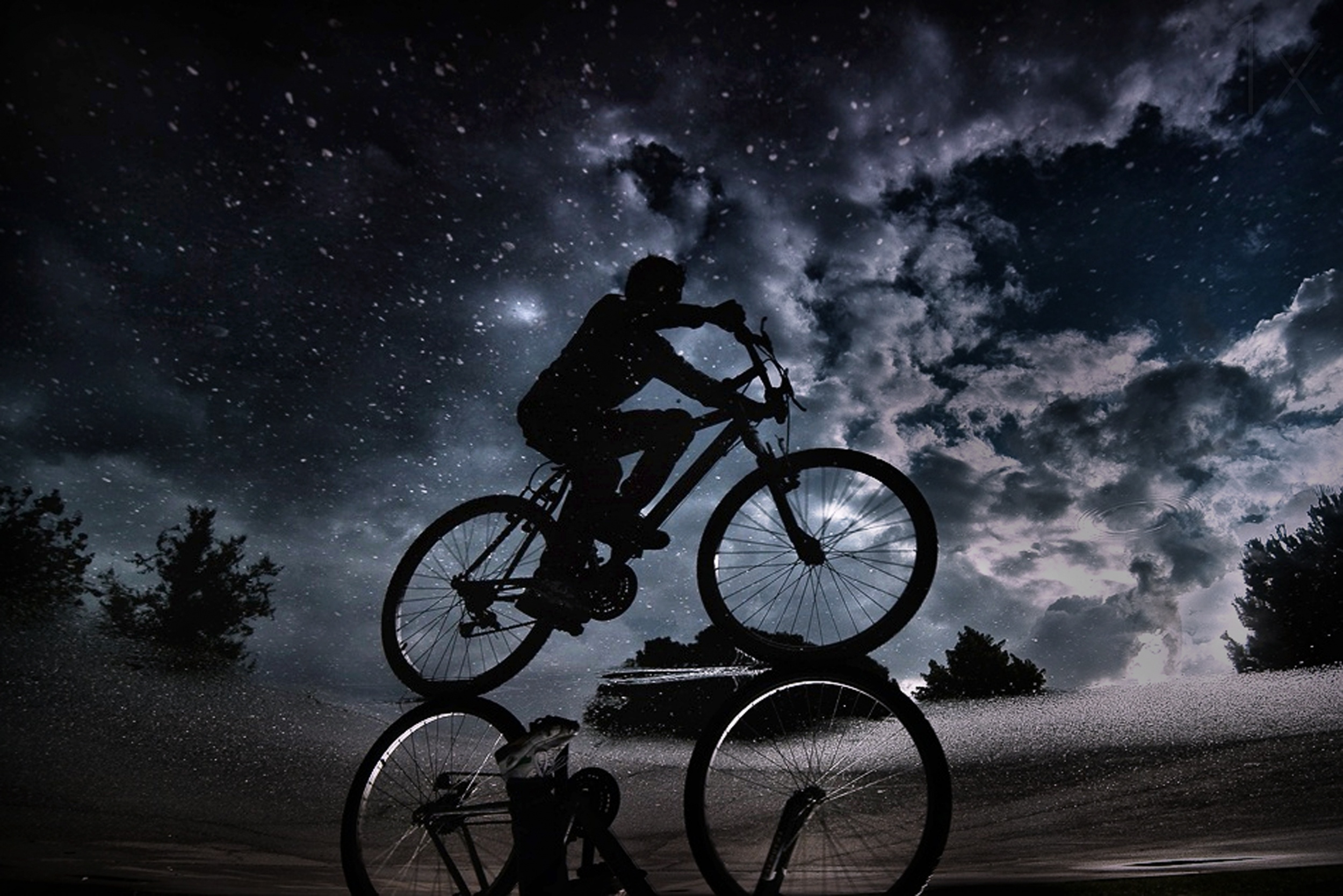 The clouds eventually parted and the sunlight illuminated this puddle of water. Shortly afterward a boy showed up on his bicycle behind me, and his reflection appeared at the edge of the water. It was the perfect location for my kind of photo, so I turned around with my camera and fired away as he peddled by.